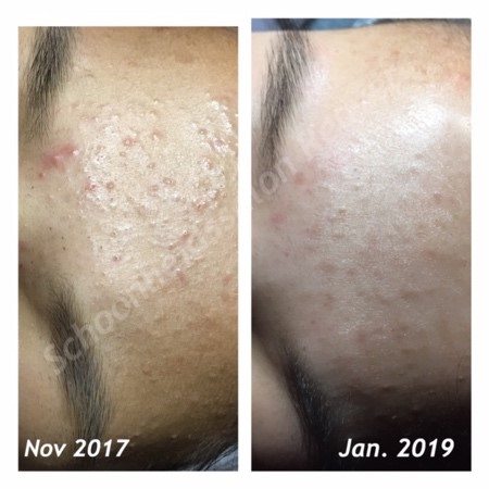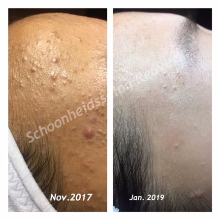 Op het eind heb ik Liana en haar moeder voorzien van een passend productadvies, dat de acne behandeling ook thuis optimaal ondersteunt. O.a. een oliereiniger voor de verwijdering van overtollig talg, UV-filters, (waterproof) make-up en ander vuil; een foamwash met Salicylzuur om o.a. ontstekingen tegen te gaan en een passende dag- en nachtverzorging. Ik heb haar op het hart gedrukt dat ze deze producten trouw moest gaan gebruiken, 2x per dag zowel in de ochtend als in de avond. Dat is voor een puber niet altijd even gemakkelijk en na een kleine terugval heeft ze het goed opgepakt!