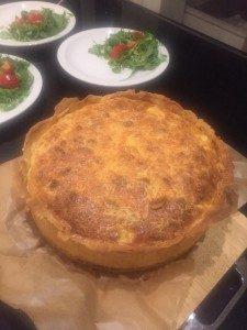 Als je het quichedeeg nog niet klaar hebt dan kun je deze nu maken. Bekleed de bakvom met bakpapier en vet de randen in. Rol het deeg uit en bekleed de bakvorm hiermee. Prik gaatjes in de bodem en bestrooi met paneermeel. Klop de eieren los met de ricotta en breng op smaak met flink wat peper en zout. Schep de helft van de pompoen over de quichevorm en verdeel wat geitenkaas en hazelnoten er over.